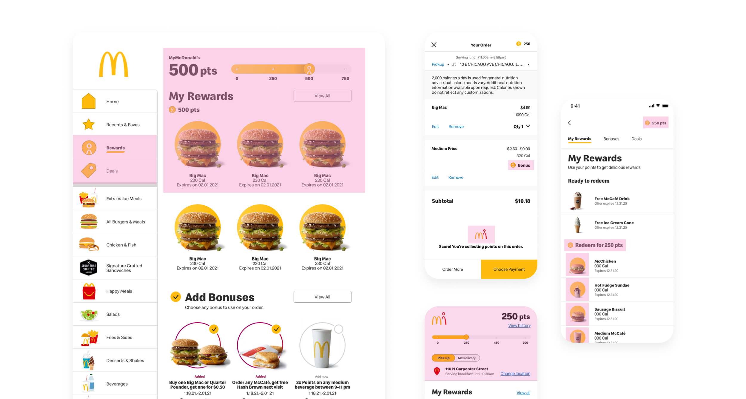 In isolation, we could start to see pieces of the brand coming together. It became instantly clear how we could use the new gradient in the halo, allowing us to instantly identify reward items, focus content, as well as feature more illustrative moments. A favorite detail of mine has always been the stack of coins paired with a reward item point value. It’s distinct, recognizable, and smartly uses the McDonald’s ‘Golden Arches’ as the coin highlight.
