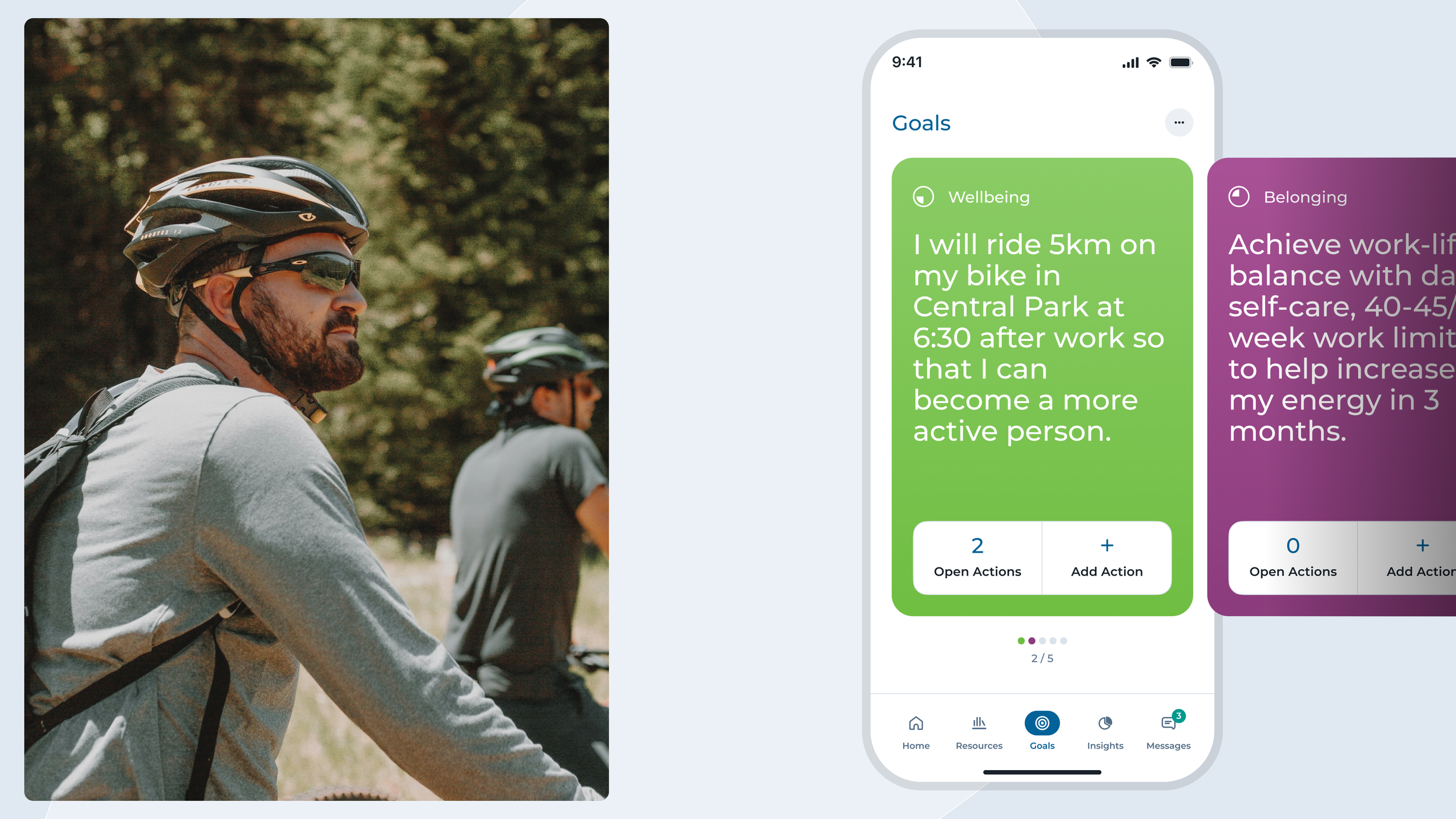 Goals are set to be achieved over the course of three months. Within each Goal, patients are tasked to assign Actions; bite-sized, daily tasks that can be logged easily throughout the patient’s week in service of the larger goal.