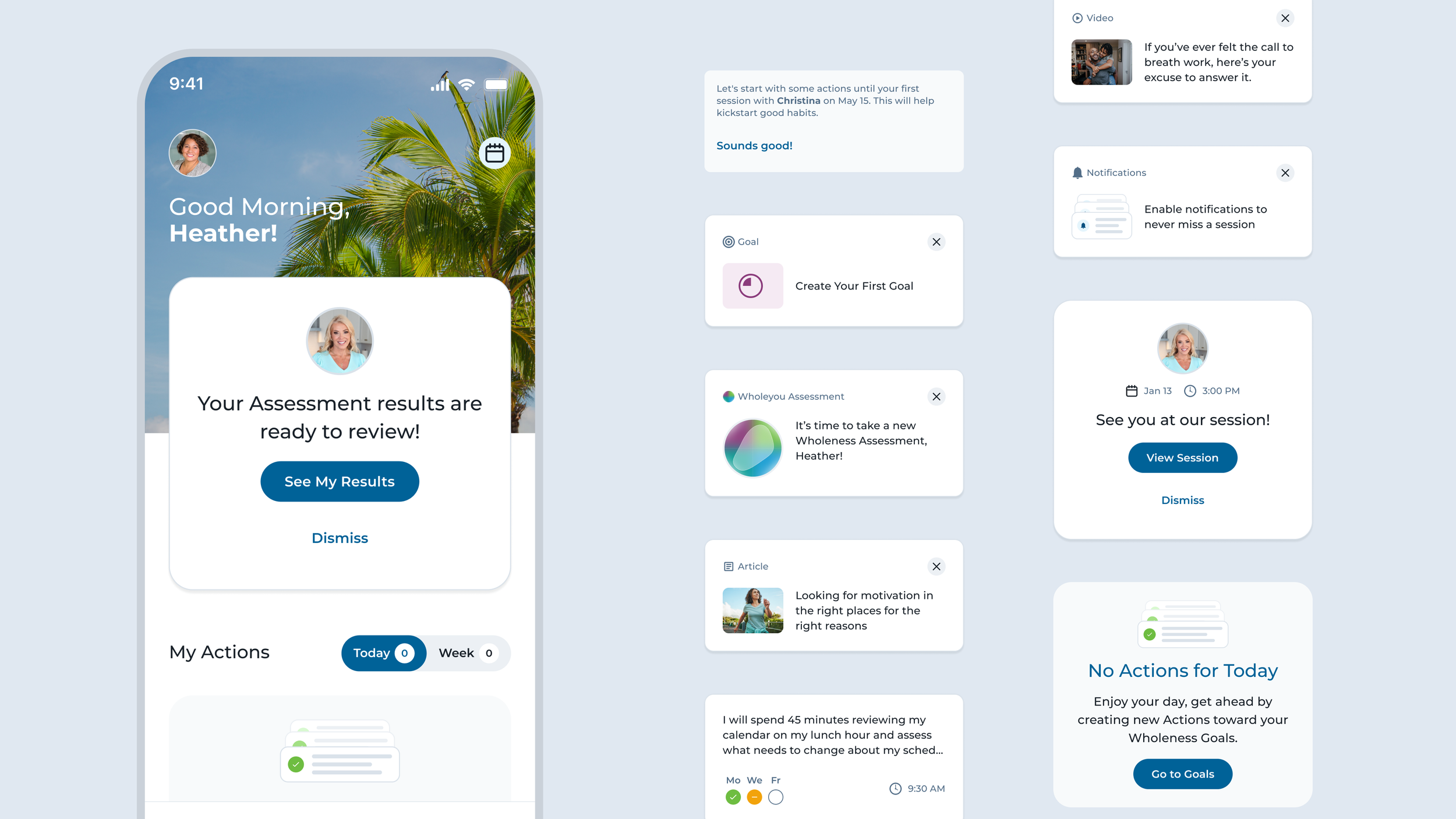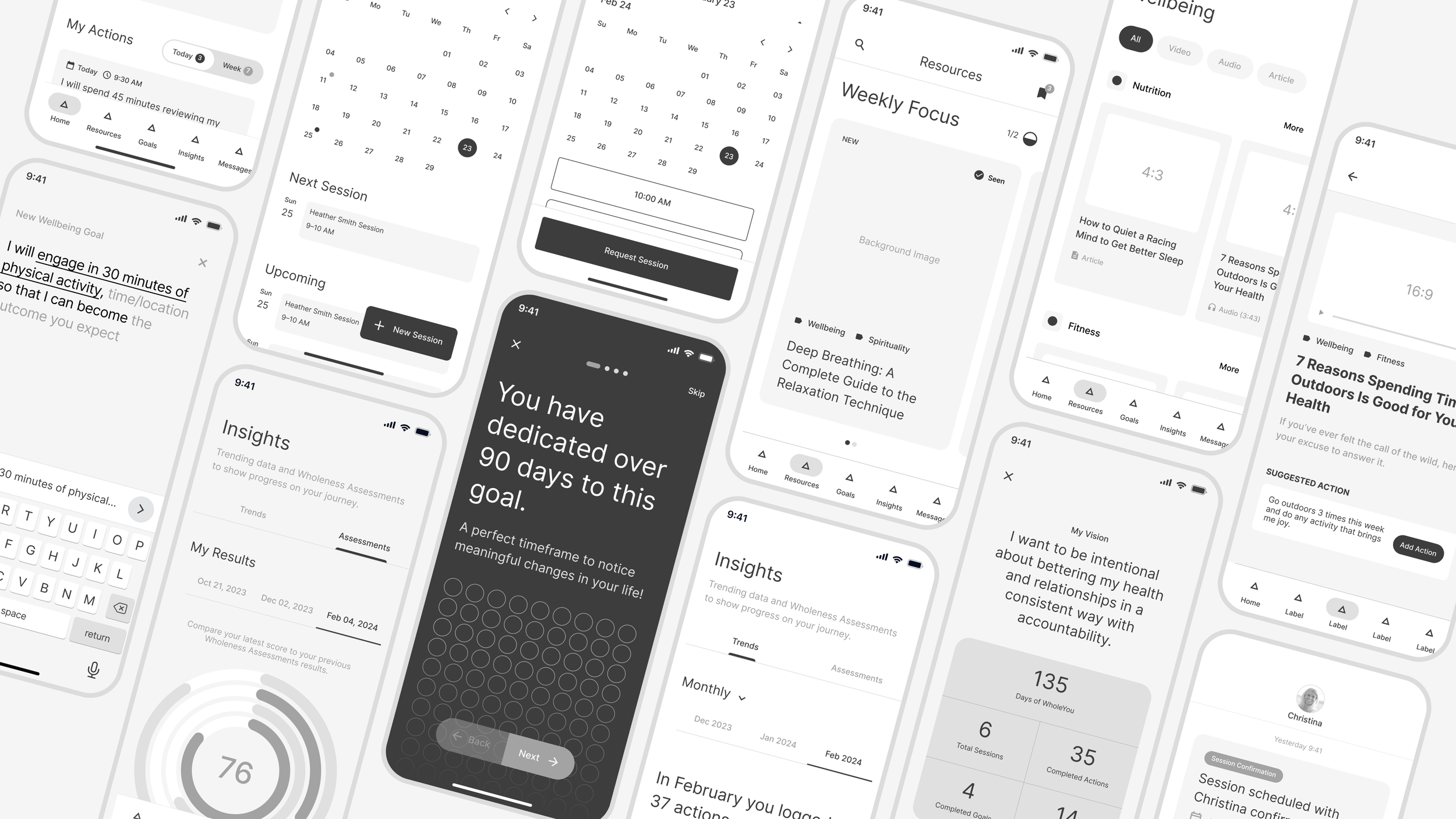 Before design ever began, as with every project I work on, every screen of the entire experience was built in high-fidelity wireframes and prototyped in full with our primary stakeholders, as well as piloted with early-adopters on the patient side. We tested logic around suggested actions and goals, different models of tracking wholeness, as well as overall usability.